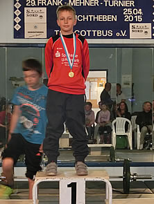 Mit drei Sportlern nahm die TSG am traditionellen 29. Frank Mehner Turnier in Cottbus teil. Maiko Ziebart wurde mit neuer Bestleistung von 19kg im Reißen und 28kg im Stoßen Klassenbester in der Gruppe der Kinder A. Teamkamerad Tino Jahnke verbesserte sich ebenfalls, konnte aber durch den Abzugswert den es auf das Körpergewicht gibt und verrechnet wird mit der Reiß –und Stoßleistung nur Platz 4 belegen. Sein Comeback nach zweijähriger Pause versuchte Dustin Lars Senf (Gruppe Schüler) mit 40kg und 50kg im Reißen und Stoßen wofür es Platz sechs gab.