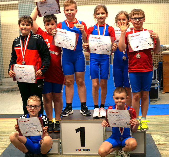 Wie schon zuvor bei den Landesmeisterschaften in der Altersklasse 11 bis 14 trafen sich am zurückliegenden Wochenende die jüngsten in den Jahrgängen 2013 und jünger, um ihr Können an der Hantel und in der Athletik zu zeigen. Von der TSG Angermünde nahmen 6 Sportlerinnen und Sportler teil. Trotz der ungünstigen Trainingsbedingungen auf Grund der Sanierung der Turnhalle konnten sich alle recht gut auf diesen Wettstreit vorbereiten. So steigerte sich Tom Koriath Jahrgang 2013 im Zweikampf in den Disziplinen Reißen und Stoßen mit 21kg und 25kg. Auch in der Athletik konnten weitere Punkte durch Weiten von 5,22m im Schlussdreisprung und 7,13 im Kugelschocken erzielt werden wofür es Silber gab. Silber auch für Joane Jachmann Jahrgang 2014. Die Bronzemedaille ging an Sofia Piperidou Jahrgang 2014 und Jamy Schälicke Jahrgang 2013. Beide knackten im Schlussdreisprung die 5m Marke und konnten sich so den Platz auf dem Siegerpodest sichern. Platz Vier und Fünf ging an Lennard Kempin und Leonard Wieczorkiewicz. Lennard war bei der technischen Ausführung im Zweikampf nicht ganz so versiert, stach aber mit der zweitbesten Weite von 5,38m im Schlussdeisprung in seiner Altersklasse hervor.