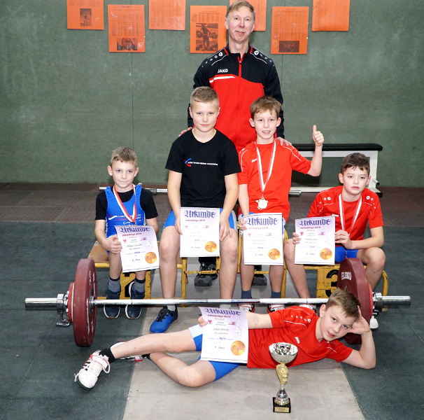 Hier erkämpfte Sven mit 25kg im Reißen neue Bestleistung. Im Stoßen dagegen konnte Sven sein Leistungspotential nicht voll ausschöpfen und schaffte nur 25kg im dritten Versuch. Im zweiten Teil der Athletik konnte verlorener Rückstand wieder gut gemacht werden was am Ende aber nur für Platz 6 reichte. Zeitgleich stritten Kinder B bis D in den athletischen Disziplinen Kugelschocken, Schlussdreisprung und Pendellauf. Hier verbesserten sich Frederik Ruh, Jakob Hönicke, Malte Rudick und Julia Busch Kinder B mit Zeiten von 11,26sek bis 12,5sek. Aber auch die Weiten im Kugelschocken zeigen bei allen eine gute Vorbereitung. Im Schlussdreisprung wurde Malte Rudick mit 5,18m Tagesbester im Jahrgang 2010 gefolgt von Frederik Ruh mit der zweitbeste Weite von 5,35m im Jahrgang 2009. Aber auch die Ergebnisse in den Teildisziplinen Reißen und Stoßen lassen Erfolge erkennen. So konnte Jakob Hönicke mit verbesserter Technik 17kg im Reißen und 19kg im Stoßen bewältigen. Julia Busch verbesserte sich mit 24kg im Reißen und 27kg im Stoßen um 3kg und erreichte damit Gold. Ebenso Gold für Malte Rudick. Die dritte Medaille Silber erkämpfte Philipp Schneider startend bei den Kindern C Jahrgang 2011 durch Verbesserungen in drei Disziplinen. Bronze nahm Frederik Ruh mit nach Hause gefolgt von Jakob Hönicke mit dem vierten Platz. In der Vereinswertung stieg die TSG in diesem Jahr von Platz 5 auf Platz 4 auf.