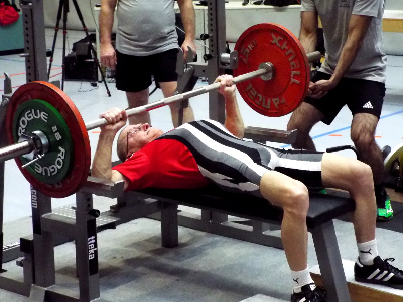 Austragungsort der Meisterschaft war das 500km entfernte Coburg. Die Wettkämpfe zogen sich durch die hohe Anzahl von 219 Teilnehmern über zwei Tage hin. Erster Heber für die TSG war Hubert Gramsch Gewichtsklasse bis 59kg in der Altersklasse IV. Seine beiden ersten Versuche mit 95 und 100kg konnten souverän bestritten werden und legalisierten hier schon den Deutschen Rekord von 92,5kg in dieser Gewichtsklasse. Beim Versuch noch die 102,5kg in die Wertung zu bringen zwang ein technischer Fehler zum vorzeitigen Abbruch. Zweiter Heber Helmut Hasse lieferte sich in der Gewichtsklasse bis 120kg in der Altersklasse III ein hartes Kopf an Kopf Rennen mit Uwe Dörfert vom Powerliftingverein Duisburg. Nach einem ersten gültigen Versuch mit 125kg legte Hasse mit 130kg vor, Dörfert zog mit 132,5kg nach. Beide steigerte im letzten Versuch auf 137,5kg. Dörfert scheiterte an dieser Last. Hasse bewältigte dieses Gewicht und schaffte Bronze. Glückwunsch für beide Sportler durch einen Deutschen Rekord in der Gewichtklasse bis 59kg und einer Bronzemedaille.