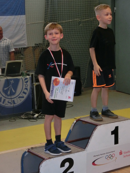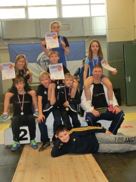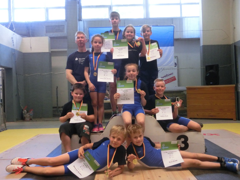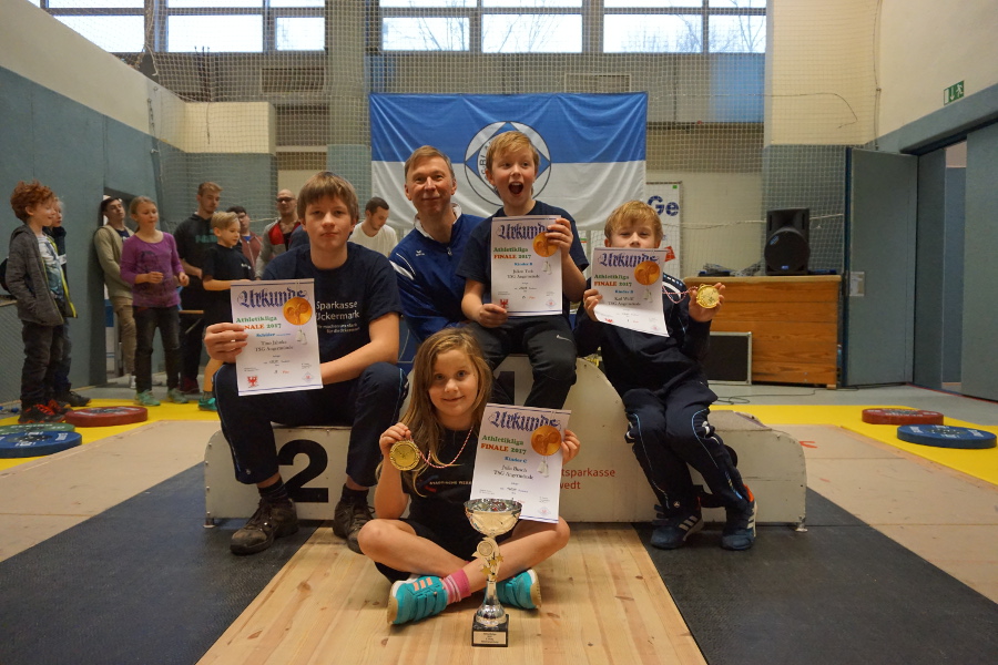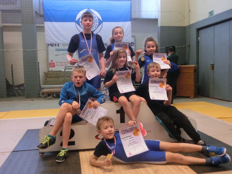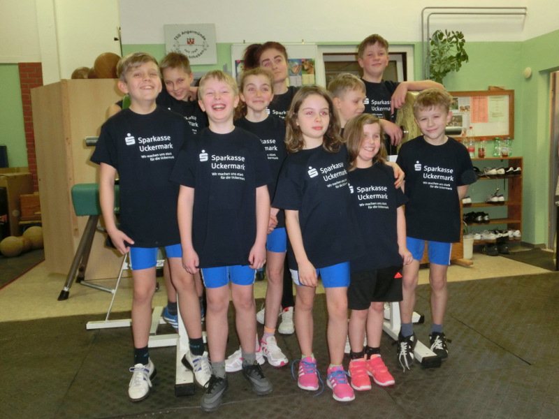 Aus sieben Vereinen des Landes Brandenburg kämpften 76 Sportlerinen und Sportler am vergangenen Wochenende in der Nord –und Südstaffel im olympischen Zweikampf und der Athletik. In der Nordstaffel stritten der SV Motor Eberswalde und die TSG Angermünde beim TSV Blau -Weiß 65 Schwedt. Mit nur 25 jungen Athleten in der Kategorie Schüler 2003 bis 2005 und den Kindern A bis D Jahrgang 2006 bis 2010 und jünger war das Teilnehmerfeld sehr überschaubar. Trotz des geringen Teilnehmerfeldes bedingt durch Krankheitsausfälle war das Leistungsniveau doch sehr hoch. So schaffte Tino Jahnke startend bei den Schülern mit neuer Bestleistung von 110kg im Zweikampf und Weiten von 10,40m im Kugelschocken und 6,94m im Schlussweitsprung seine erste Goldmedaille für die TSG. Gold auch für Karl Wolff und Collin Peters Kinder A durch bessere Technik beim Reißen und Stoßen und der Athletik. Kämpferisch zeigte sich auch Domenic Radtke bei der Kraftübung Bankdrücken (geforderte Höchstzahl 15 Wiederholungen) und dem erstmaligen Präsentieren des Stoßens wofür es Bronze gab in dieser Kategorie. In der Gruppe der Kinder B Jahrgang 2008/ 2009 demonstrierten drei von vier Angermündern erstmalig ihr Können im Umgang mit der Hantel beim Reißen. So konnte Julia Busch mit guten Fertigkeiten in dieser olympischen Teildisziplin und Verbesserungen im Pendellauf 14,0sek und Schlussweitsprung 1,40m die vierte Goldmedaille für Angermünde holen. Frederik Ruh stritt an diesem Tag das erste mal um Weiten und Punkte und erkämpfte in seinem ersten Wettkampf ebenfalls das begehrte Edelmetall. Julien Tech und Justin Goede kompletierten das Quartett und punkteten im Pendellauf 12,9sek und Kugelschocken 6,76m wofür es Silber und Platz 4 gab. Die sechste Goldmedaille für Angermünde erzielte Malte Rudick in der Gruppe der Kinder C Jahrgang 2010. Mit reichlich Edelmetall im Gepäck war der anschließende Lohn der Besuch im Aquari –UM .