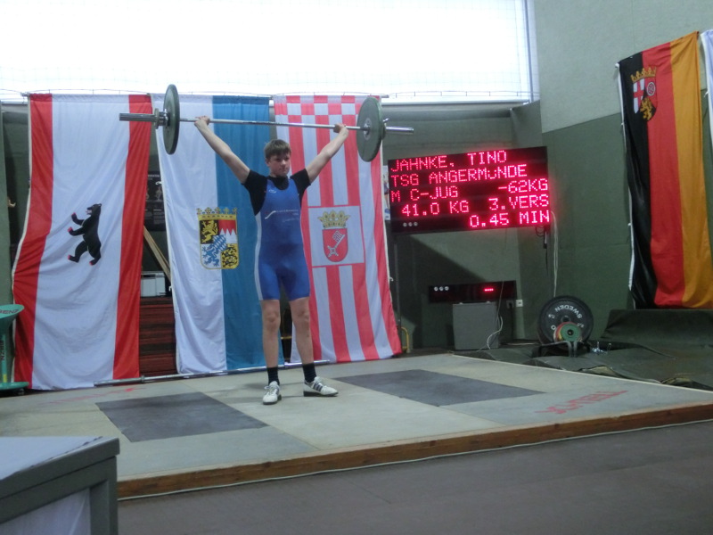 Der ASK Frankfurt/O war in diesem Jahr Ausrichter der Deutschen Meisterschaften der Schüler. Bundesweit reisten 138 Teilnehmer aus 53 Vereinen der Jahrgänge 2002 bis 2004 in die Oderstadt. Ausgetragen wurde die Meisterschaft im olympischen Zweikampf und der Athletik bestehend aus 30m Sprint, Kugelschocken und Schlussdreisprung. Von der TSG Angermünde nahmen Tino Jahnke und Maiko Ziebarth teil. Beide konnten in Vorkämpfen die geforderten 180 bzw 200 Punkte durch besserer Technik und höherer Last erreichen was eine Qualifizierung möglich machte.Nach dem Wiegen und der Vorstellung gab es eine Einteilung in drei Gruppen leicht, mittel und schwer. Tino Jahnke startet in der Gruppe Mittel Jahrgang 2004 und hatte sich gegen 10 weitere Kontrahenten durch zusetzten. Mit dem Anfangsgewicht von 37kg und den weiteren Versuchen von 39 und 41kg konnte neue Bestleistung in der ersten Teildisziplin Reißen erreicht werden. Ebenso entschlossen auch der Auftritt im Stoßen mit drei gültigen Versuchen und neuer Bestleistung von 52kg. Mit diesem Zweikampfergebnis von 93kg lag Tino nach wie vor auf Platz 6. Weitere Punkte gabs in der Athletik durch 8,87m im Kugelschocken und 6,44m im Schlussdreisprung sowie der Zeit von 4,54sek im 30m Sprint was ihm am Ende mit 466,22 Punkten den Rang 5 einbrachte. Maiko Ziebarth Jahrgang 2003 hob in der Gruppe leicht. Seine Zielstellung für diesen Tag im Reißen waren 29kg was ihm mit drei gültigen Versuchen souverän gelang. Konzentriert und selbstbewusst auch der Auftritt im Stoßen mit 35kg. Weitere Punkte kamen in der Athletik durch Weiten von 6,98m und 6,47m im Kugelschocken und Schlussdreisprung dazu. Am Ende reichte es diesmal nur für Platz 8 von 10 Startern. Beide hoben mit diesem Wettkampf das erste mal auf nationaler Ebene und legten mit ihrer Platzierung den Grundstein für weitere größere Wettkämpfe.