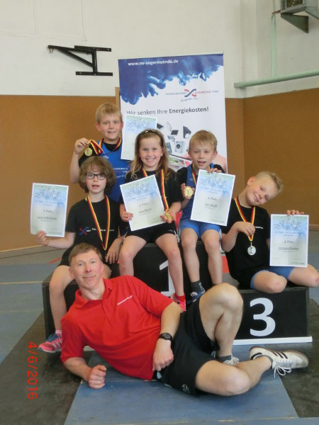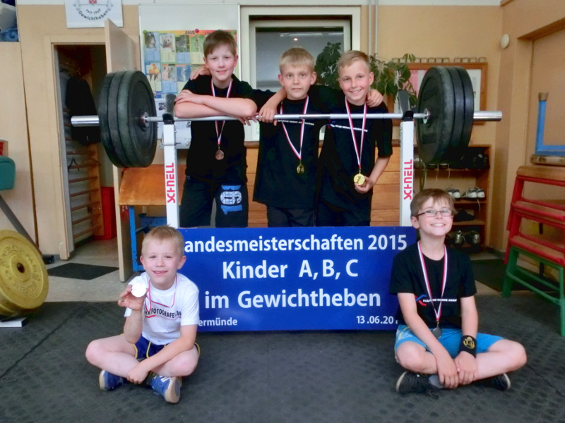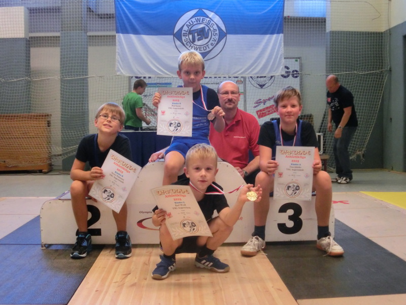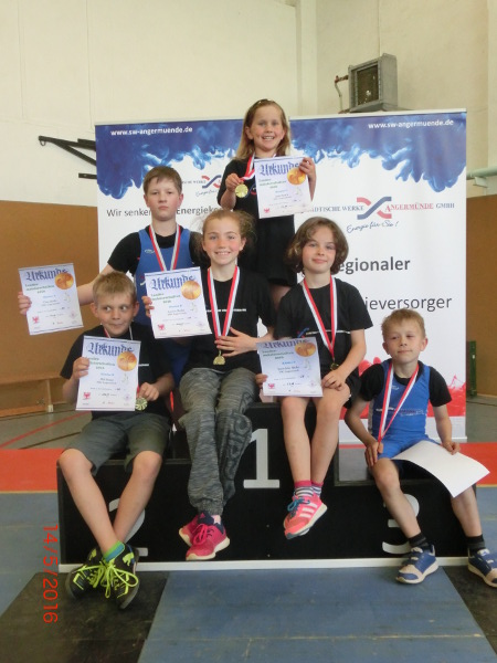 Bei besten Wetter präsentierte sich die TSG Angermünde für die Ausrichtung der diesjährigen Landesmeisterschaft bei den Kindern A bis C. Der Ausschreibung folgten 41 Teilnehmer aus sieben Vereinen des Landes Brandenburg. Gekämpft wurde sowohl im olympischen Zweikampf Reißen und Stoßen bei den Kinder A als auch in der Athletik bestehend aus Kugelschocken, Schlussweitsprung und Pendellauf bei den Kinder B sowie Wechselsprint und Bauchmuskeltest Kinder C. Für die TSG hoben Maiko Ziebarth, Tino Janke (Kinder A), Phil Sonne und Nevio Nittmann (Kinder B) sowie Karl Wolff (Kinder C). Nach der Vorstellung und Einteilung aller Athleten begannen die Wettkämpfe im Reißen bei den Kinder B Jahrgang 2005/ 2006 mit Phil Sonne und Nevio Nittmann. Phil startete in der Gewichtsklasse bis 35kg und setzte sich mit 13kg im Reißen und einer Bestweite von 1,72m im Schlussweitsprung gegen seinen Kontrahenten Devin Steinke aus Schwedt durch wofür er Gold bekam. Neueinsteiger Nevio Nittmann GK bis 30kg war in seinem ersten Wettkampf noch sehr nervös, konnte aber durch gute Werte im Kugell-schocken und Pendellauf Silber mit nach Hause nehmen. Zeitgleich zum Reißen kämpfte die Gruppe der Kinder A Jahrgang 2003/ 2004 in der Athletik. Hier verbesserte sich Maiko Ziebarth im Schlussdreisprung (5,62m) und Pendellauf 11,5sek und schaffte mit zwei Versuchen endlich die 20kg im Reißen sowie 28kg im Stoßen. Mit diesem Ergebnis sicherte er sich Gold in der GK bis 35kg. Teamkamerad Tino Jahnke startend in der Gewichtsklasse bis 45 kg überzeugte in allen Disziplinen. Konnte sich aber gegen Zekri und Teterjatnik vom TSV B/W Schwedt nicht durchsetzen und erreichte Bronze. Jüngster Heber Karl Wolff GK bis 25kg ver-besserte sich in seinem erst zweiten Wettkampf in allen drei Schnellkraftübungen (Kugelschocken, Schlussweitsprung und Pendellauf). Konnte sich aber nicht gegen Pepe Pilz vom USC Viadrina mit 1,75m im Schluussweitsprung durchsetzen. Damit schaffte Karl Silber hinter Pepe Pilz und vor Lennox Unger vom TSV B/W Schwedt.