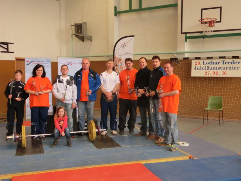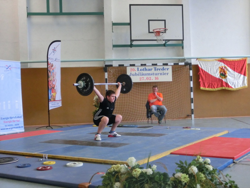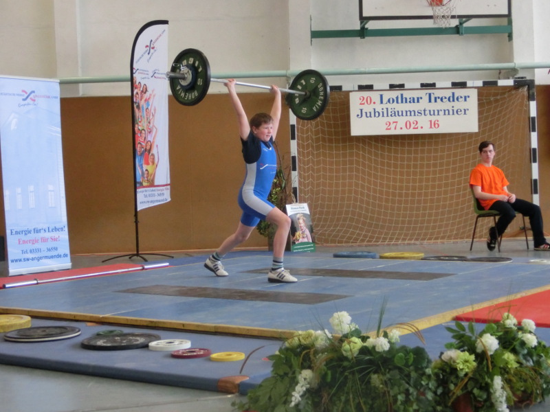 Über 20 Jahre nunmehr führt die Abteilung Gewichtheben der TSG Angermünde ihr traditionelle Lothar Treder Pokalturnier durch. Auch in diesem Jahr folgten wieder 42 junge Heber der Alterskategorie Kinder A bis Schüler aus sieben Vereinen des Landes Brandenburgs der Einladung des Ausrichters. Für Angermünde hoben Tino Jahnke Kinder A Jahrgang 2004 sowie Justin Lukas Ewald und Lara Bielke Schüler Jahrgang 2002 und 2001. Die Veranstaltung wurde in drei Gruppen unterteilt. In der ersten kämpfte die Gruppe der Kinder A um die höchste Last und den besten Punktwert. Tino Jahnke schaffte mit neuem Tagesziel von 27kg im Reißen und 32kg im Stoßen den sechsten Rang. Für die zweite Gruppe der Schüler hob für Angermünde Justin Lukas Ewald. Justin kehrte nach dreijähriger Pause zum Gewichteben zurück und erreichte mit einem Zweikampfergebnis von 71kg (Reißen 32kg, Stoßen 39kg) Platz 8. Auch Lara Bielke nahm sich eine Auszeit und erreichte in ihrem Comeback mit 35kg im Reißen und 45kg im Stoßen Platz 3. Nach der zweiten Veranstaltung wurde neben der Siegerehrung für die Gruppe der Kinder A eine Würdigung der Sportler vorgenommen die über 20 Jahre durch ihre Leistungen dieses Tunier erst populär gemacht haben. Neben Stefan Friedland, Tino Sorgalla, Toni Bailleu, Carsten Bettac und Thomas Hasse seien hier von insgesamt 40 nur einige erfolgreiche Sportler genannt. An dieser Stelle ein großer Dank an alle Helfer und Sponsoren wie den Marktfotografen, Druckerei Nauendorf und der Gasversorgung Angermünde die bei den Vorbereitungen und der Durchführung der Veranstaltung geholfen haben. Einen besonderen Dank auch an das Blumenhaus Theiß, dass dem Wettkampf durch seine innovative Dekoration das gewisse, i -Tüpfelchen über fast 20 Jahre gab.