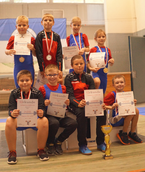 Beim Ausrichter dem TSV B/W 65 Schwedt kämpften 46 junge Heber um das begehrte Edelmetall. Von der TSG waren als erstes die jüngsten mit Sofia Piperidon, Joane Jachmann und Marley Walter an der Hantel. Alle drei konnten ihre technischen Fertigkeiten beim Ausführen der Reisversuche verbessern. Das I Tüpfelchen setzte Sofia mit der Bestzeit von 14,7sek im Lauftest in der Altersklasse 14 und jünger. Der Lohn dafür war der oberste Platz auf dem Siegerpodest gefolgt mit Silber von Joane Jachmann. Marley Walter komplettierte das Medaillenpaket mit Bronze. Zeitgleich zu den jüngsten kämpfte die Altersklasse 12 und 13 in der Athletik. Herausragend hier Luca Siedschlag und Tom Koriath mit Leistungssteigerungen in allen drei Disziplinen (Lauftest, Kugelschocken und Schlussdreisprung). Aber auch die Versuche beim Reißen und Stoßen waren ausschlaggebend für die Platzierung. So schaffte Tom mit 20kg im Stoßen 5,0 Technikpunkte und bekam dafür Bronze. Luca stieß 27kg hatte sich aber im Reißen verletzt und konnte dadurch nur Platz vier erzielen. Silber und Bronze gingen an Kenny Hannig und Lennard Kempin durch verbesserten Weiten im Schlussdreisprung 5,02m Lennard und 4,84m Kenny sowie im Kugelschocken 6,33m Kenny und 4,16m Lennard. Neueinsteiger Jamy Schälike überzeugte in seinem ersten Wettkampf trotz Platz vier mit einer guten Trainingsvorbereitung. Mit sechs Medaillen konnte die TSG in der Vereinswertung Platz drei erreichen hinter dem TSV B/W Schwedt und dem ASK Frankfurt/O. Nach zwei Wochen Herbstferien gehts in die Vorbereitung für die Finalrund im Dezember.