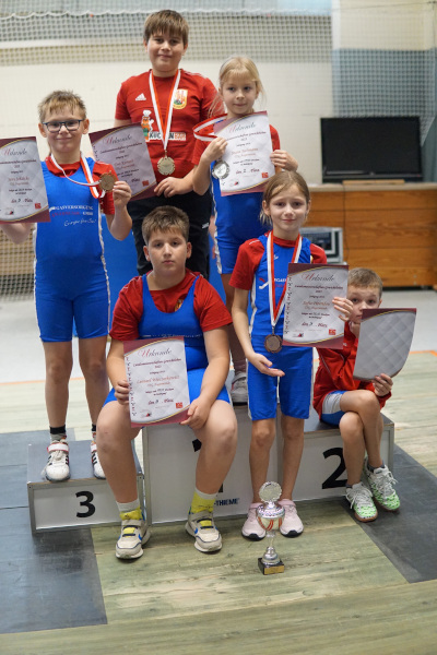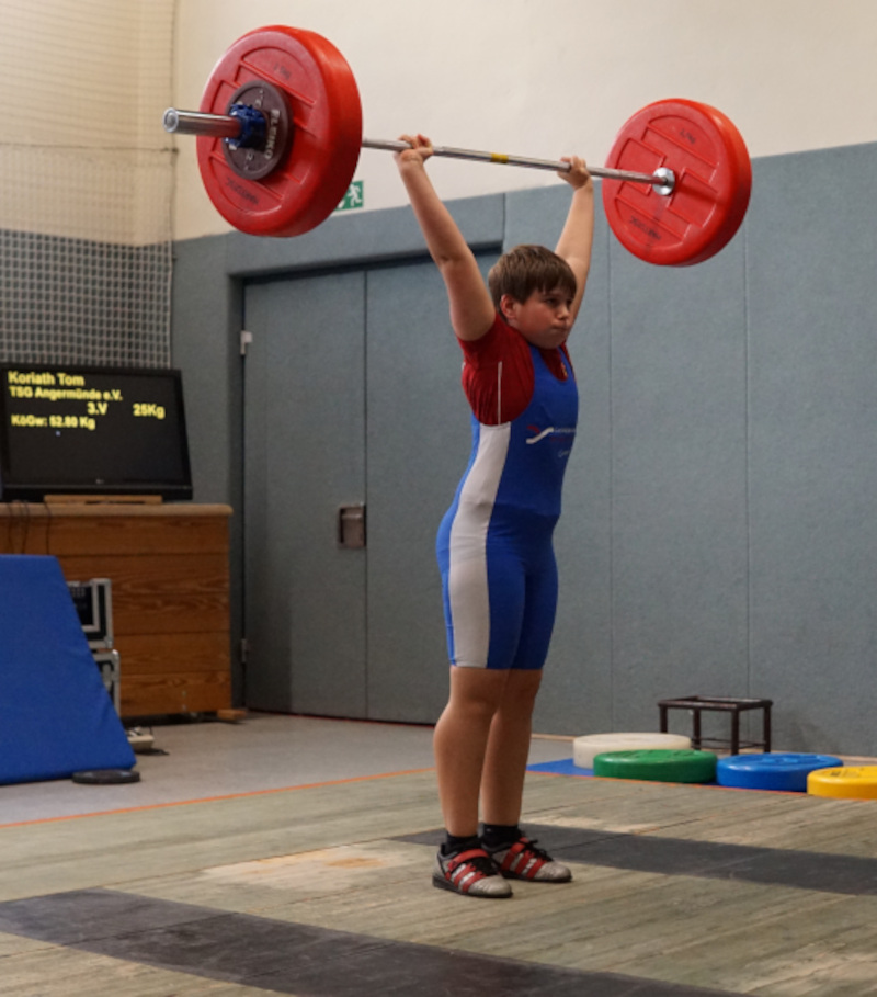 Wie schon zuvor bei den Landesmeisterschaften in der Altersklasse 11 bis 14 trafen sich am zurückliegenden Wochenende die jüngsten in den Jahrgängen 2013 und jünger, um ihr Können an der Hantel und in der Athletik zu zeigen. Von der TSG Angermünde nahmen 6 Sportlerinnen und Sportler teil. Trotz der ungünstigen Trainingsbedingungen auf Grund der Sanierung der Turnhalle konnten sich alle recht gut auf diesen Wettstreit vorbereiten. So steigerte sich Tom Koriath Jahrgang 2013 im Zweikampf in den Disziplinen Reißen und Stoßen mit 21kg und 25kg. Auch in der Athletik konnten weitere Punkte durch Weiten von 5,22m im Schlussdreisprung und 7,13 im Kugelschocken erzielt werden wofür es Silber gab. Silber auch für Joane Jachmann Jahrgang 2014. Die Bronzemedaille ging an Sofia Piperidou Jahrgang 2014 und Jamy Schälicke Jahrgang 2013. Beide knackten im Schlussdreisprung die 5m Marke und konnten sich so den Platz auf dem Siegerpodest sichern. Platz Vier und Fünf ging an Lennard Kempin und Leonard Wieczorkiewicz. Lennard war bei der technischen Ausführung im Zweikampf nicht ganz so versiert, stach aber mit der zweitbesten Weite von 5,38m im Schlussdeisprung in seiner Altersklasse hervor.