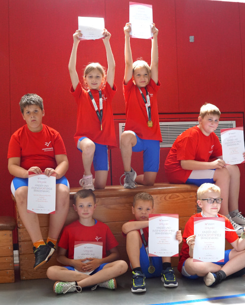 Zum letzten mal vor den Sommerferien trafen sich Brandenburgs Gewichtheber zu den Landessportspielen. Aus sieben Vereinen reisten 57 Sportlerinnen und Sportler der Jahrgänge 2011 bis 2016 und jünger nach Brandenburg. Gekämpft wurde in fünf Disziplinen die vorher aus fünf Pools durch einzelne Sportler aus den Vereinen ausgewählt wurden. Für die TSG Angermünde nahmen sieben Sportler teil. Ganz oben auf dem Siegerpodest präsentierten sich Sofia Piperidou AK 10 und Lillie Pioch AK 11. Sofia lief im 60m Lauf beiden Kontrahenten weit voraus und erreichte eine Zeit von 9,84sek. Lillie konnte im Geschicklichkeitslauf dem H2 mit 10,92sek punkten. Silber erreichten Lennard Kempin AK 11 und Louis Lange AK 10 durch hohe Wiederholungszahlen und Weiten in der Bankhocke (Sprünge mit geschlossenen Beinen über eine Turnbank) und Medezinballstoßen (Medezinball von der Brust nach vorn Stoßen). Über Bronze freute sich Neueinsteiger Lennard Hoffmann AK 8. Trotz hervorragender Leistung beim Rückenmuskeltest gingen die Plätze vier und fünf an Mitch Friedland AK 11und Leonard Wieczorkiewicz AK 10. Nach diesem sportlichen Vergleich enden die Wettkämpfe vor der Sommerpause. Allen Sportlern der Abteilung Gewichtheben erholsame Ferien.