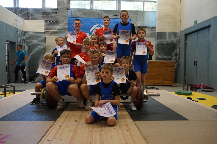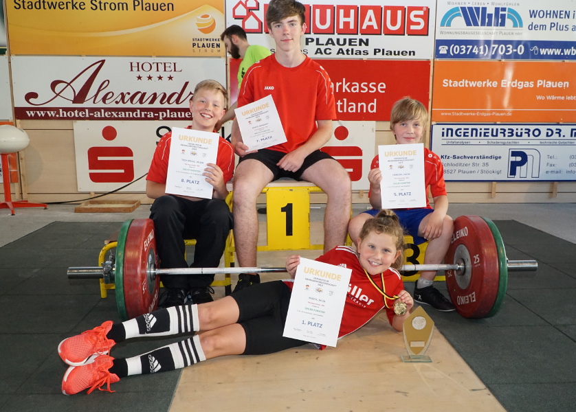 Hier erkämpfte Sven mit 25kg im Reißen neue Bestleistung. Im Stoßen dagegen konnte Sven sein Leistungspotential nicht voll ausschöpfen und schaffte nur 25kg im dritten Versuch. Im zweiten Teil der Athletik konnte verlorener Rückstand wieder gut gemacht werden was am Ende aber nur für Platz 6 reichte. Zeitgleich stritten Kinder B bis D in den athletischen Disziplinen Kugelschocken, Schlussdreisprung und Pendellauf. Hier verbesserten sich Frederik Ruh, Jakob Hönicke, Malte Rudick und Julia Busch Kinder B mit Zeiten von 11,26sek bis 12,5sek. Aber auch die Weiten im Kugelschocken zeigen bei allen eine gute Vorbereitung. Im Schlussdreisprung wurde Malte Rudick mit 5,18m Tagesbester im Jahrgang 2010 gefolgt von Frederik Ruh mit der zweitbeste Weite von 5,35m im Jahrgang 2009. Aber auch die Ergebnisse in den Teildisziplinen Reißen und Stoßen lassen Erfolge erkennen. So konnte Jakob Hönicke mit verbesserter Technik 17kg im Reißen und 19kg im Stoßen bewältigen. Julia Busch verbesserte sich mit 24kg im Reißen und 27kg im Stoßen um 3kg und erreichte damit Gold. Ebenso Gold für Malte Rudick. Die dritte Medaille Silber erkämpfte Philipp Schneider startend bei den Kindern C Jahrgang 2011 durch Verbesserungen in drei Disziplinen. Bronze nahm Frederik Ruh mit nach Hause gefolgt von Jakob Hönicke mit dem vierten Platz. In der Vereinswertung stieg die TSG in diesem Jahr von Platz 5 auf Platz 4 auf.