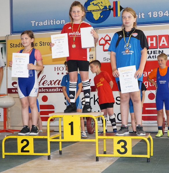 Austragungsort der diesjährigen Ostdeutschen Mehrkampfmeisterschaften war in diesem Jahr der AC Atlas Plauen. Aus drei Bundesländern Sachsen, Berlin und Brandenburg kämpften 94 junge Heberinnen und Heber der Jahrgänge 2005 bis 2009 in der Gruppe der Schüler und Kindern A und B um vordere Plätze. Für die TSG Angermünde starteten Benedikt Drafz, Julien Tech Kruse, Jakob Hönicke und Julia Busch. Nach einer fünfstündigen Anreise bei hochsommerlichen Temperaturen am Vortag begannen die Wettkämpfe im olympischen Zweikampf und der Athletik bestehend aus Kugelschocken, Schlussdreisprung, Bankdrücken, Hindernisslauf H 1 und 30m Sprint. Gehoben wurde in 13 Gruppen leicht und schwer abhängig von der Teilnehmeranzahl und dem Körpergewicht. Erster an der Hantel für Angermünde war Jakob Hönick. Jakob zeigte sich in seinem ersten Versuch mit 14kg noch sehr nervös konnte dann aber mit der zweiten Hebung einen recht guten Technikpunktwert erzielen. Zweite Heberin in der Gruppe der Kinder B war Julia Busch. Auch Julia viel es schwer sich zu konzentrieren und hob mit 18kg zweimal ungültig. Jetzt war Fingerspitzengefühl und Mut machen von Trainer und Eltern angesagt um den dritten gewährten Versuch in die Wertung zu bringen was dann auch mit einem Technikpunktwert von 4,5 gelang. Nach dem nervösen Start im Reißen konnten beide in der Athletik durch Bestleistungen punkten. So sicherte sich Julia mit der Weite von 5,95m im Kugelschocken und der Zeit von 13,7sek im Hindernislauf den Platz ganz oben auf dem Siegerpodest. Aber auch Jakob gelang es in vier Disziplinen sich zu verbessern. Leider reichte es diesmal nur für Platz fünf. In der Gruppe der Kinder A hob Julien Tech Kruse. Auch Julien fand bei diesen Temperaturen nicht so richtg in den Wettkampf und brachte mit 22kg nur eine Hebung in die Wertung. Besser lief es bei den athletischen Übungen Bankdrücken und Schlussdreisprung. Aber auch hier reichten die Werte am Ende nur für Platz 8. Vierter Heber für die TSG Benedikt Drafz hob in der Gruppe der Schüler Jahrgang 2005. Benedikt bestritt seinen Wettkampf zuerst in der Athletik. Hier gelang ihm ein Punktplus im Bankdrücken mit der geforderten Anzahl von 15 Wiederholungen. Bei den weiteren Disziplinen konnten keine Leistungssteigerungen erreicht werden. Nach einer sehr langen Pause der olympische Teil. Hier konnte mit 43kg im Reißen noch mal Bestleistung erzielt werden. Im Stoßen wurden die 53kg im dritten Versuch anvisiert, konnten aber durch einen technischen Fehler (Nachdrücken) nicht in die Wertung gebracht werden damit nur Platz 8.
