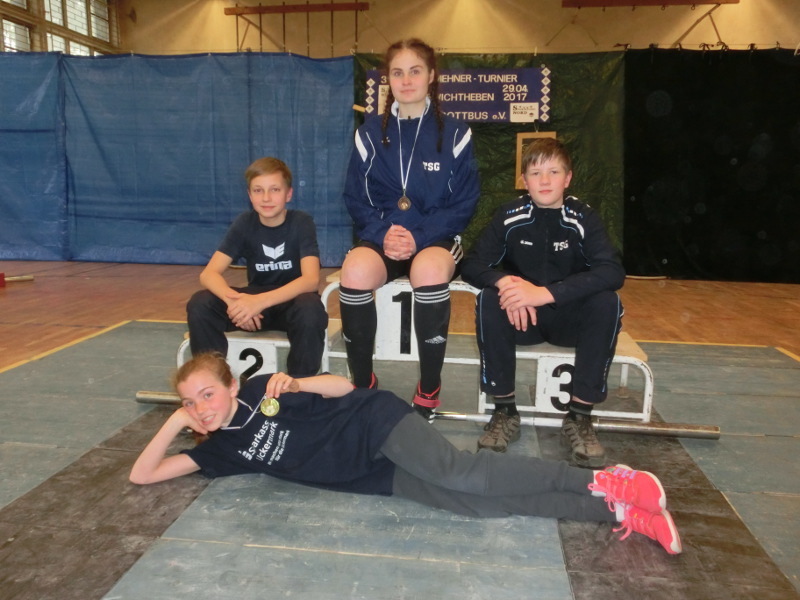 Mit vier Athleten nahm die TSG Angermünde am 31. Frank Mehner Turnier im 200km entfernten Cottbus teil. Gestartet wurde in der Kategorie Kinder A Jahrgang 2005/ 2006 den Schülern 2002 bis 2004 und der Jugend bis zu den Masters. Für Angermünde hoben Leonie und Lara Bielke, Tino Jahnke und Maiko Ziebarth. Alle vier kehrten mit Bestleistungen in den beiden Teildisziplinen Reißen und Stoßen und zwei Medaillen im Gepäck zurück. Ganz weit vorn jüngste Teilnehmerin Leonie Bielke Kinder A mit einer Leistungssteigerung von 8kg und der ersten Medaille in Gold. Auch Maiko Ziebarth zeigte sich kämpferisch mit jeweils 3kg mehr durch 27kg im Reißen und 31kg im Stoßen. Teamkamerad Tino Jahnke verbesserte sich mit 36kg im Reißen und 46kg im Stoßen um 5kg. Beide erreichten bei den Schülern die Plätze sechs und vier. Lara Bielke startend in der Gruppe der Jugend Jahrgang 2000/ 2001 schaffte mit sechs gültigen Versuchen 96kg im Zweikampf und damit die zweite Medaille für Angermünde in Bronze.