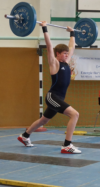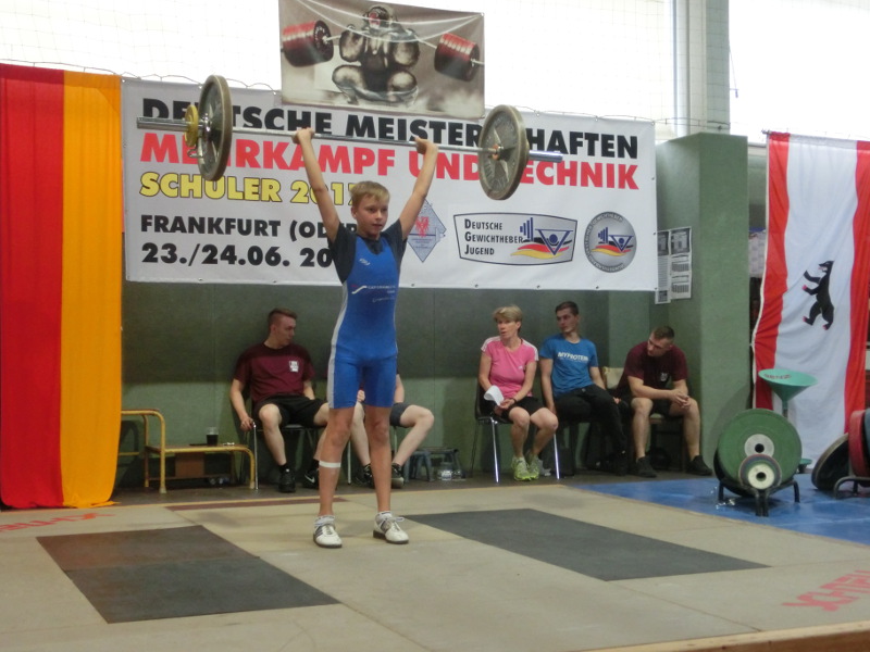 Der ASK Frankfurt/O war in diesem Jahr Ausrichter der Deutschen Meisterschaften der Schüler. Bundesweit reisten 138 Teilnehmer aus 53 Vereinen der Jahrgänge 2002 bis 2004 in die Oderstadt. Ausgetragen wurde die Meisterschaft im olympischen Zweikampf und der Athletik bestehend aus 30m Sprint, Kugelschocken und Schlussdreisprung. Von der TSG Angermünde nahmen Tino Jahnke und Maiko Ziebarth teil. Beide konnten in Vorkämpfen die geforderten 180 bzw 200 Punkte durch besserer Technik und höherer Last erreichen was eine Qualifizierung möglich machte.Nach dem Wiegen und der Vorstellung gab es eine Einteilung in drei Gruppen leicht, mittel und schwer. Tino Jahnke startet in der Gruppe Mittel Jahrgang 2004 und hatte sich gegen 10 weitere Kontrahenten durch zusetzten. Mit dem Anfangsgewicht von 37kg und den weiteren Versuchen von 39 und 41kg konnte neue Bestleistung in der ersten Teildisziplin Reißen erreicht werden. Ebenso entschlossen auch der Auftritt im Stoßen mit drei gültigen Versuchen und neuer Bestleistung von 52kg. Mit diesem Zweikampfergebnis von 93kg lag Tino nach wie vor auf Platz 6. Weitere Punkte gabs in der Athletik durch 8,87m im Kugelschocken und 6,44m im Schlussdreisprung sowie der Zeit von 4,54sek im 30m Sprint was ihm am Ende mit 466,22 Punkten den Rang 5 einbrachte. Maiko Ziebarth Jahrgang 2003 hob in der Gruppe leicht. Seine Zielstellung für diesen Tag im Reißen waren 29kg was ihm mit drei gültigen Versuchen souverän gelang. Konzentriert und selbstbewusst auch der Auftritt im Stoßen mit 35kg. Weitere Punkte kamen in der Athletik durch Weiten von 6,98m und 6,47m im Kugelschocken und Schlussdreisprung dazu. Am Ende reichte es diesmal nur für Platz 8 von 10 Startern. Beide hoben mit diesem Wettkampf das erste mal auf nationaler Ebene und legten mit ihrer Platzierung den Grundstein für weitere größere Wettkämpfe.