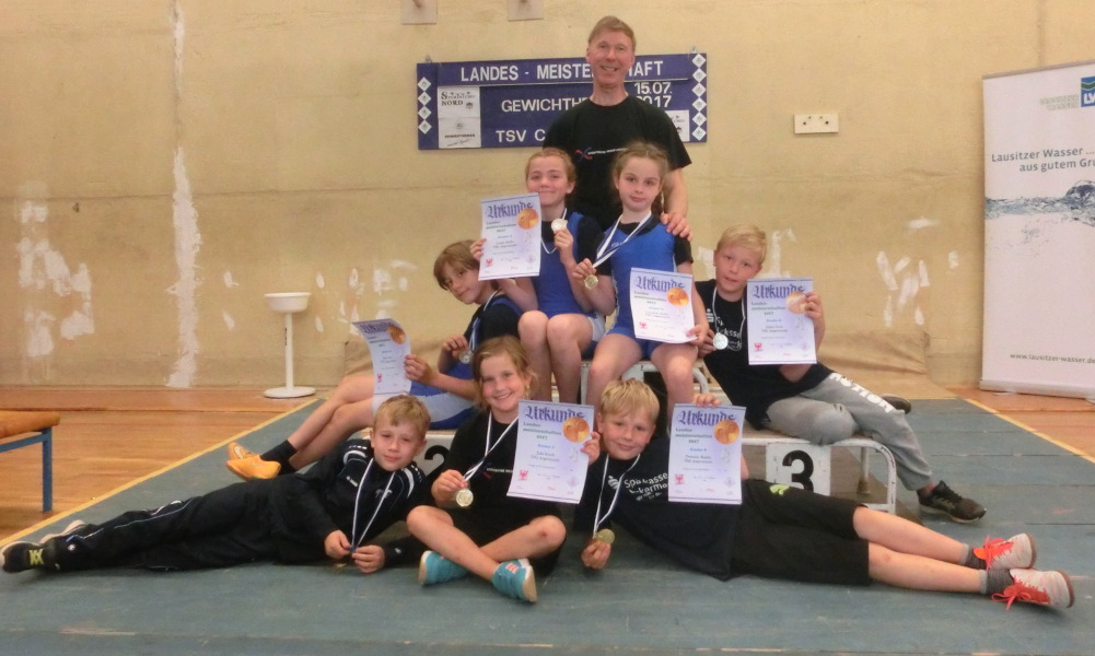 Zum letzten Championat vor den Sommerferien reisten 7 Sportler der TSG Angermünde zu den Landesmeisterschaften in der Gruppe der Kinder A bis C nach Cottbus. Aus sieben Vereinen des Landes Brandenburgs kämpften 48 junge Gewichtheber der Jahrgänge 2005 bis 2012 um die begehrten Medaillen. Gekämpft wurde im olympischen Zweikampf (Reißen/ Stoßen) und einem athletischen Teil bestehend aus Schlussdreisprung, Kugelschocken, Pendellauf und dem Bauchmuskeltest bei den Kindern C. Den Anfang machte die Gruppe der Kinder A Jahrgang 2005/ 2006. Erster an der Hantel Kean Aprin startend in der Gewichtsklasse bis 45kg schaffte in seinem ersten Wettkampf mit drei Versuchen 21kg und lag damit erst einmal vorn. Unkonzentriertheit und Nervosität in der zweiten Disziplin dem Stoßen brachten nur einen Versuch mit 19kg in die Wertung. Wertvolle Punkte kamen in der Athletik beim Schlussdreisprung 5,17m und dem Pendellauf 13,0sek dazu was letztlich die Silbermedaille brachte. Leonie Bielke startend in der Gewichtsklasse bis 40kg verbesserte ihr Zweikampfergebnis durch 21kg im Reißen und 23kg im Stoßen um 4kg und erreichte ebenfalls Silber. Zeitgleich zum olympischen Zweikampf kämpfte die Gruppe der Kinder B und C in der Athletik. In der stärksten besetzten Gewichtsklasse bis 30kg domenierte Karl Wolff durch Tagesbestleistungen im Pendellauf 11,4 sek, der Weite von 1,77m im Schlussweitsprung und 7,05 im Kugelschocken. Aber auch die Leistung von 15kg im Reißen durch besseren Technikwert versetzte seine fünf Kontrahenten auf die nachfolgenden Plätze. Weiterhin Landesmeister wurden in ihrer Gewichtsklasse Domenic Radtke bis 40kg und Luna Jolie Bielke bis 32kg. Beide verbesserten sich im Kugelschocken mit 5,05 und 5,40m. Mit Silber in der Tasche durch bessere Werte im Reißen und der Athletik kehrte Julien Tech Gewichtsklasse bis 40kg zurück. Der vierte Landestitel ging an die jüngste Teilnehmerin aus dem Angermünder Team Julia Busch Gewichtsklasse bis 28kg durch bessere Weiten im Kugelschocken 5,65m sowie Schlussweitsprung 1,32m und dem 12m Wechselsprint mit einer Zeit von 6,9sek. Mit vier Landestiteln und drei Silbermedaillen geht die Abteilung Gewichtheben in die wohlverdiente Sommerpause.
