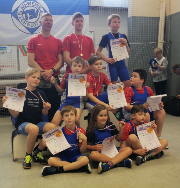 Aus sieben Vereinen des Landes Brandenburg kämpften 76 Sportlerinen und Sportler am vergangenen Wochenende in der Nord –und Südstaffel im olympischen Zweikampf und der Athletik. In der Nordstaffel stritten der SV Motor Eberswalde und die TSG Angermünde beim TSV Blau -Weiß 65 Schwedt. Mit nur 25 jungen Athleten in der Kategorie Schüler 2003 bis 2005 und den Kindern A bis D Jahrgang 2006 bis 2010 und jünger war das Teilnehmerfeld sehr überschaubar. Trotz des geringen Teilnehmerfeldes bedingt durch Krankheitsausfälle war das Leistungsniveau doch sehr hoch. So schaffte Tino Jahnke startend bei den Schülern mit neuer Bestleistung von 110kg im Zweikampf und Weiten von 10,40m im Kugelschocken und 6,94m im Schlussweitsprung seine erste Goldmedaille für die TSG. Gold auch für Karl Wolff und Collin Peters Kinder A durch bessere Technik beim Reißen und Stoßen und der Athletik. Kämpferisch zeigte sich auch Domenic Radtke bei der Kraftübung Bankdrücken (geforderte Höchstzahl 15 Wiederholungen) und dem erstmaligen Präsentieren des Stoßens wofür es Bronze gab in dieser Kategorie. In der Gruppe der Kinder B Jahrgang 2008/ 2009 demonstrierten drei von vier Angermündern erstmalig ihr Können im Umgang mit der Hantel beim Reißen. So konnte Julia Busch mit guten Fertigkeiten in dieser olympischen Teildisziplin und Verbesserungen im Pendellauf 14,0sek und Schlussweitsprung 1,40m die vierte Goldmedaille für Angermünde holen. Frederik Ruh stritt an diesem Tag das erste mal um Weiten und Punkte und erkämpfte in seinem ersten Wettkampf ebenfalls das begehrte Edelmetall. Julien Tech und Justin Goede kompletierten das Quartett und punkteten im Pendellauf 12,9sek und Kugelschocken 6,76m wofür es Silber und Platz 4 gab. Die sechste Goldmedaille für Angermünde erzielte Malte Rudick in der Gruppe der Kinder C Jahrgang 2010. Mit reichlich Edelmetall im Gepäck war der anschließende Lohn der Besuch im Aquari –UM .