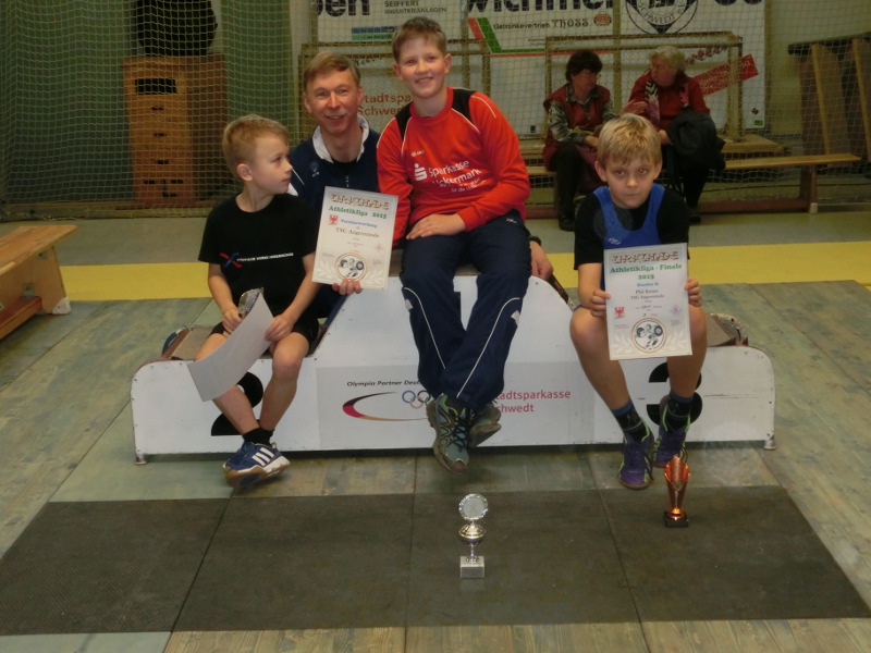Zum letzten Kräftemessen in diesem Jahr trafen sich junge Athleten in der Gruppe Schüler und Kinder A bis C um in der Finalrunde der Athletikliga die Besten zu ermitteln. Von der TSG Angermünde qualifizierten sich Tino Jahnke Kinder A, Phil Sonne Kinder B und Karl Wolff Kinder C.Voraussetzung für die Qualifizierung war die Teilnahme an den beiden Vorrunden und eine hohe Gesamtpunktzahl um unter die ersten Sechs zu kommen. Alle drei hatten sich langfristig auf diesen Höhepunkt vorbereitet. Das zeigte am besten Tino Jahnke durch sechs gültigen Versuche im olympischen Zweikampf schaffte er nicht nur persönliche Bestleistung, sondern konnte auch seine Zielstellung für 2015 erreichen. Überzeugend auch der Auftritt in der Athletik mit 1,83m im Schlussweitsprung, 7,27m im Kugelschocken und der Zeit von 12,1sek im Pendellauf was ihm letztlich auf Platz 5 brachte. Phil Sonne schöpfte sein Leistungsvermögen an diesem Tag nicht voll aus. Trotz verbesserter Technik im Reißen mit 5,8 Punkten scheiterte Phil an 15kg. Auch in den anderen Disziplinen blieb er weit unter seinen Erwartungen und erreichte nur Platz 3 hinter Devin Steinke TSV B/W Schwedt und Lio Kronschwitz AC Potsdam. In der jüngsten Gruppe der Kinder C kämpfte Karl Wolff in den Disziplinen Bauch –und Rückenmuskeltest, Schlussweitsprung, Kugelschocken, 10m Wechselsprint und dem turnerischen Teil. Hier schaffte Karl mit 28 Wiederholungen in 30 sek im Bauchmuskeltest den höchsten Tageswert. Aber auch 1,60m im Schlussweitsprung und 5,34sek im Wechselsprint sorgten für die nötigen Punkte, um am Ende auf dem 2 Platz stehen zu können hinter Pepe Pilz vom USC Viadrina. In der Gesamtwertung gemessen an der Anzahl der startenden Sportler und den erreichten Plazierungen erreichte die TSG Angermünde den siebenten Platz in der Vereinswertung.