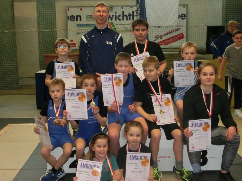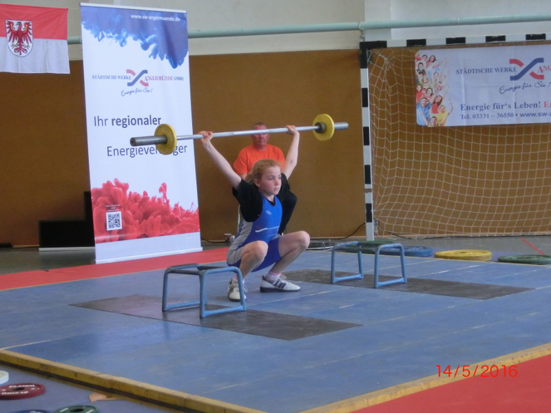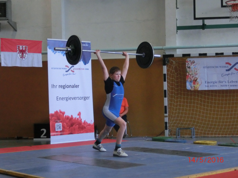 Zum wiederholten Male war in diesem Jahr die TSG Angermünde Ausrichter der Landesmeisterschaften Kinder A bis C im Gewichtheben. Der Einladung folgten 35 Teilnehmer aus sieben Vereinen des Landes Brandenburg. Gekämpft wurde im olympischen Zweikampf dem Reißen und Stoßen sowie der Athletik in den Disziplinen Kugelschocken, Pendellauf und Schlussdreisprung sowie 10m Wechselsprint und Bauchmuskeltest bei den Kindern C. Nach dem Wiegen aller Teilnehmer wurde die Einteilung in die entsprechenden Gewichtsklassen vorgenommen. In der ersten Gruppe Kinder A bestehend aus 17 Hebern hob für Angermünde Tino Jahnke. Tino, startend in der Gewichtsklasse bis 50 kg setzte sich gleich zu Beginn mit dem Zweikampfergebnis von 64 kg (Reißen 28kg und Stoßen 36kg) deutlich von seinen Kontrahenten Adrian Urban vom ASK Frankfurt durch 20 Punkten mehr ab. Noch mehr Vorsprung und damit den Sieg brachten die Ergebnisse von 8,00m im Kugelschocken und 5,55m im Schlussdreisprung. Zeitgleich zur Gruppe A stritten die Kinder B und C in der Athletik. Hier kämpften Leonie Bielke, Phil Sonne und Karl Wolff. Leonie hob in der Gewichtsklasse bis 36kg und erreichte mit 5,55m im Kugelschocken sowie 1,66m im Schlussweitsprung und besserer Technik Gold, Gold auch für Karl Wolff und Phil Sonne startend in der Gewichtsklasse bis 25kg und bis 40kg. Beide punkteten mit Zeiten von 12,1sek und 11,7sek im Pendellauf. Aber auch eine bessere Technik von 4,5 Punkten war mitverantwortlich für den oberen Platz auf dem Siegerpodest. In der Gruppe der Kinder C Jahrgang 2008 und jünger starteten Julia Busch und Luna –Julie Bielke. Beide stritten in der Gewichtsklasse bis 24kg und 28kg und erreichten in ihren erst zweiten Wettkampf Platz 1.